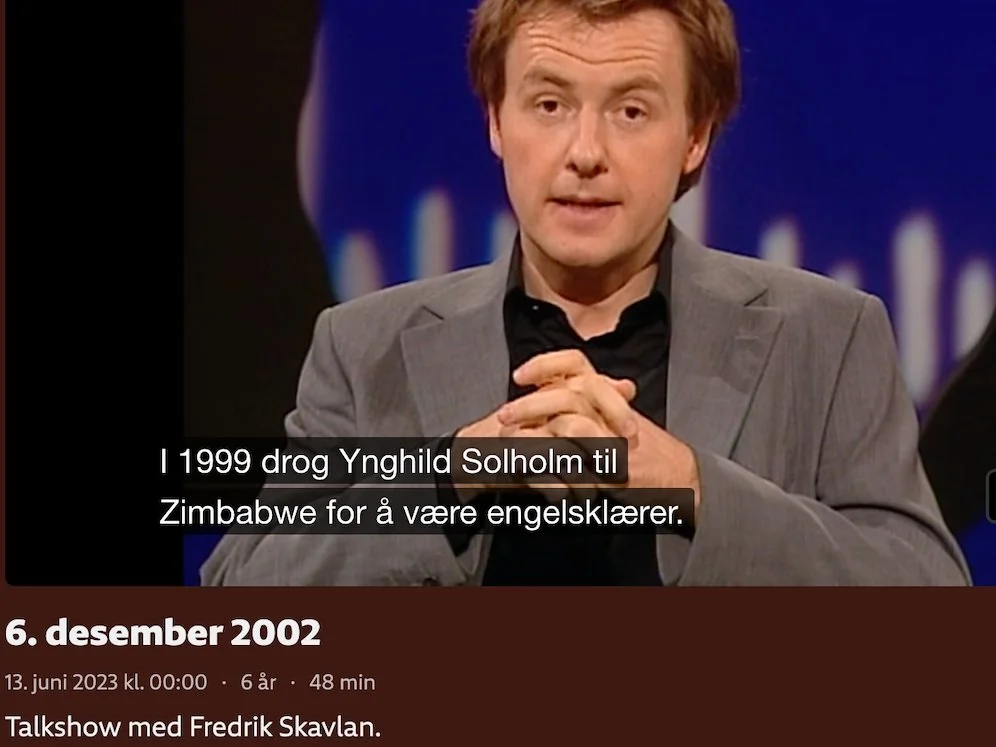 Få et herlig gjensyn med unge og modige Sabona-grunnlegger Ynghild Solholm. Ynghild hadde sin første TV-opptreden, direktesendt hos Fredrik Skavlan den 6. desember 2002.