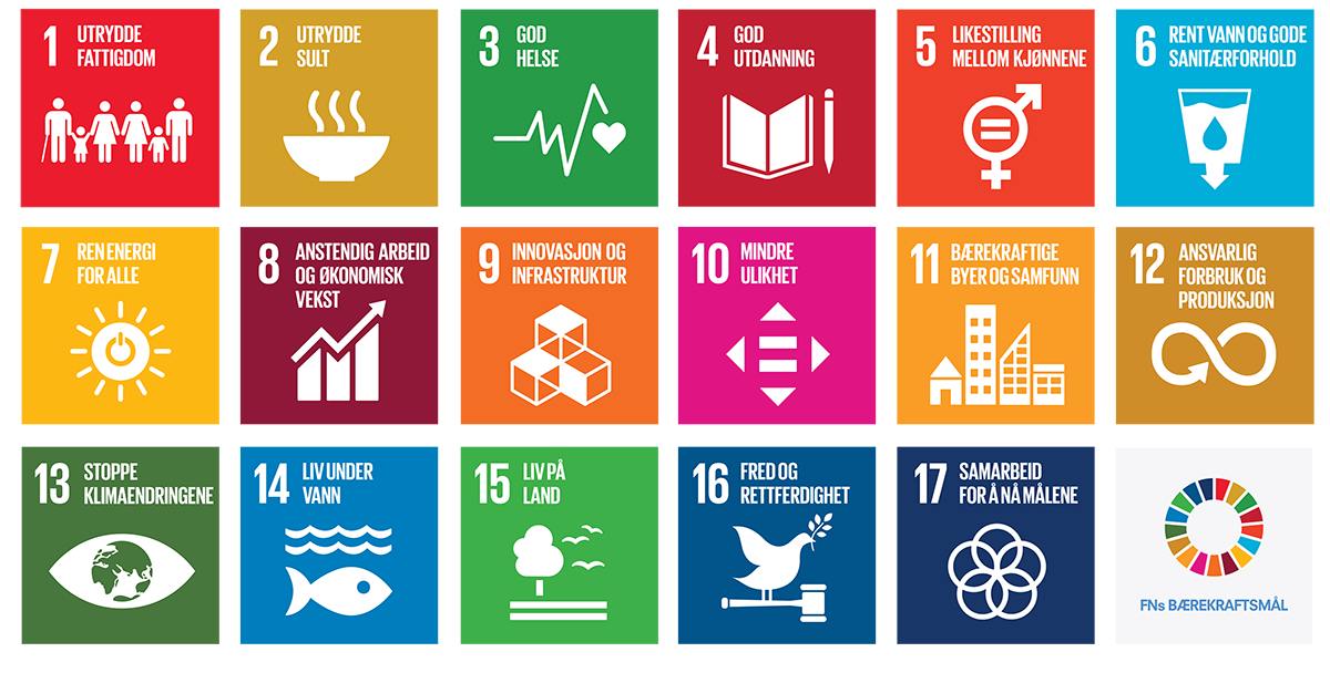 1: Utrydde fattigdom, 2: Utrydde sult, 3: God helse og livskvalitet, 4: God utdanning, 5: Likestilling mellom kjønnene, 6: Rent vann og gode sanitærforhold, 7: Ren energi for alle, 8: Anstendig arbeid og økonomisk vekst, 9: Innovasjon og infrastruktur, 10: Mindre ulikhet, 11: Bærekraftige byer og samfunn,15: Liv på land 16: Fred og rettferdighet 17: Samarbeid for å nå målene