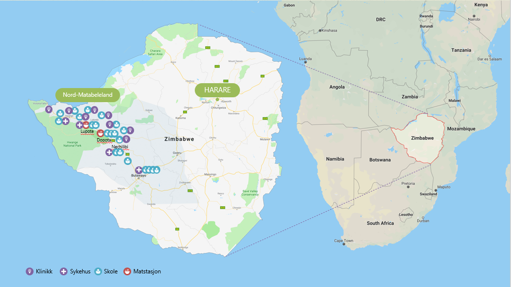 Zimbabwe ligger i det sørlige Afrika. Befolkningen er om lag 16 millioner. Det er flere folkegrupper som bor i Zimbabwe, og majoriteten tilhører befolkningsgruppen Shona (85%). Minoritetsgruppen Ndebele (15%) bor i hovedsak i Matabeleland, som er den sørvestlige delen av Zimbabwe og grenser til Zambia og Botswana.