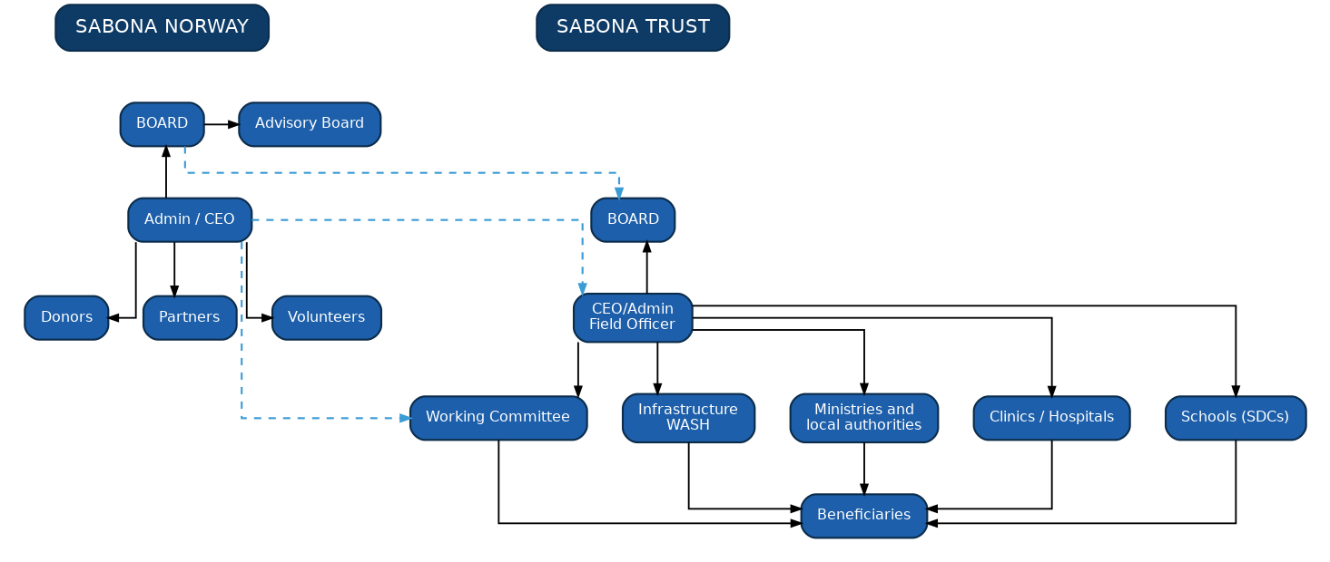 Sabona Trust i Zimbabwe er egen juridisk enhet med seks ansatte og et styre med fem medlemmer. For Sabona er det svært viktig at de som føler utfordringene på kroppen, er med å bestemme hvilke prosjekter som skal prioriteres. Det er 23 medlemmer i en «Workers Committee» er de respektive landsbyenes demokratisk valgte representanter, og rapporterer løpende behov til Sabona Trust. Sabona Norge jobber hånd i hånd med Sabona Trust og deler samme verdier og strategier.